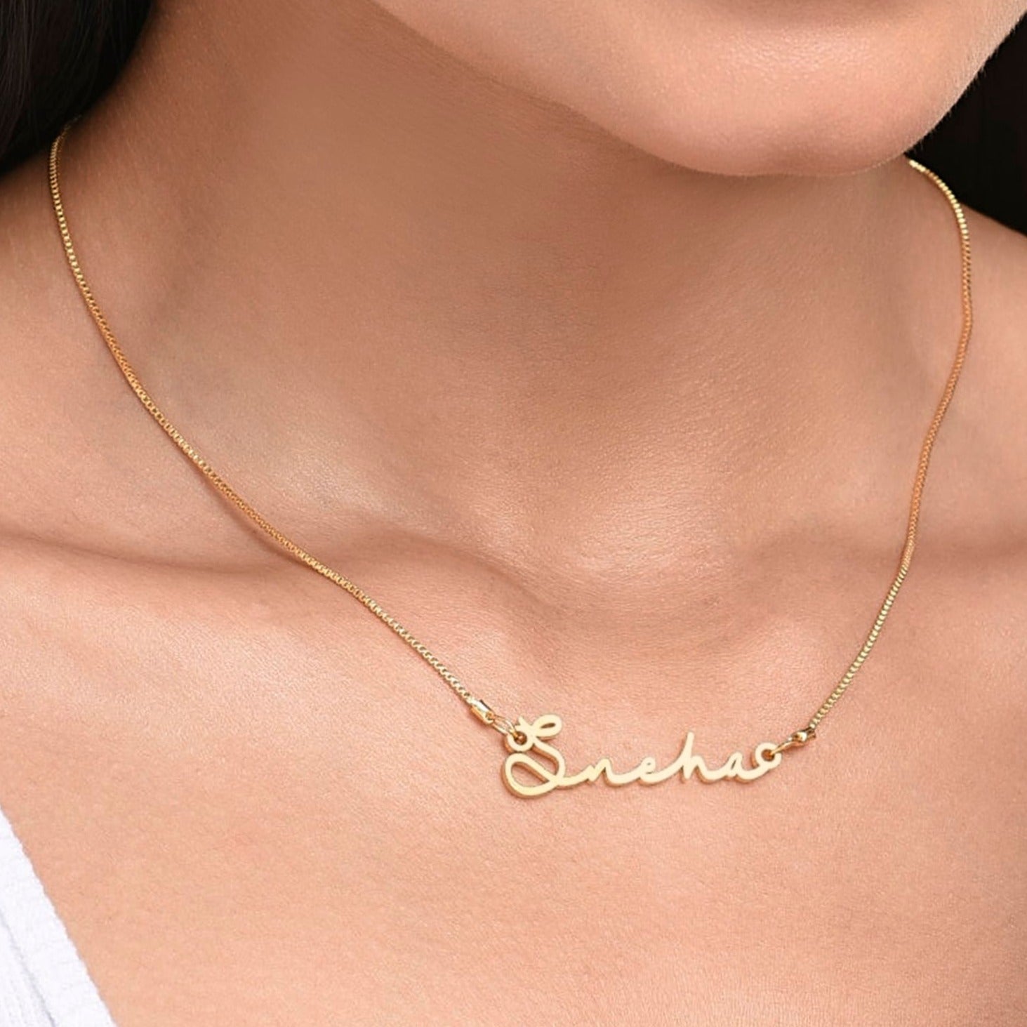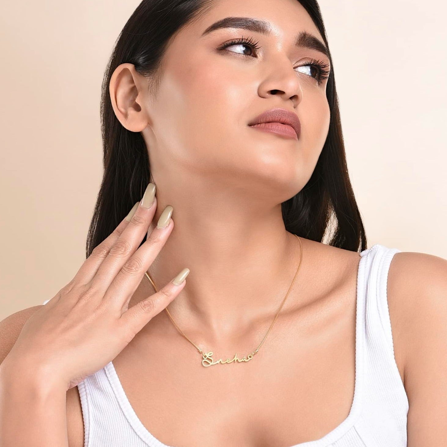 Customers Favourite !! Our Signature name necklace is a perfect fashion accessory to level up your style. Beautiful and unique this name necklace is a unique way to express your love for yourself and your loved ones and makes for a perfect surprise for her. It's a perfect gift for anniversaries, birthdays, and festivals.